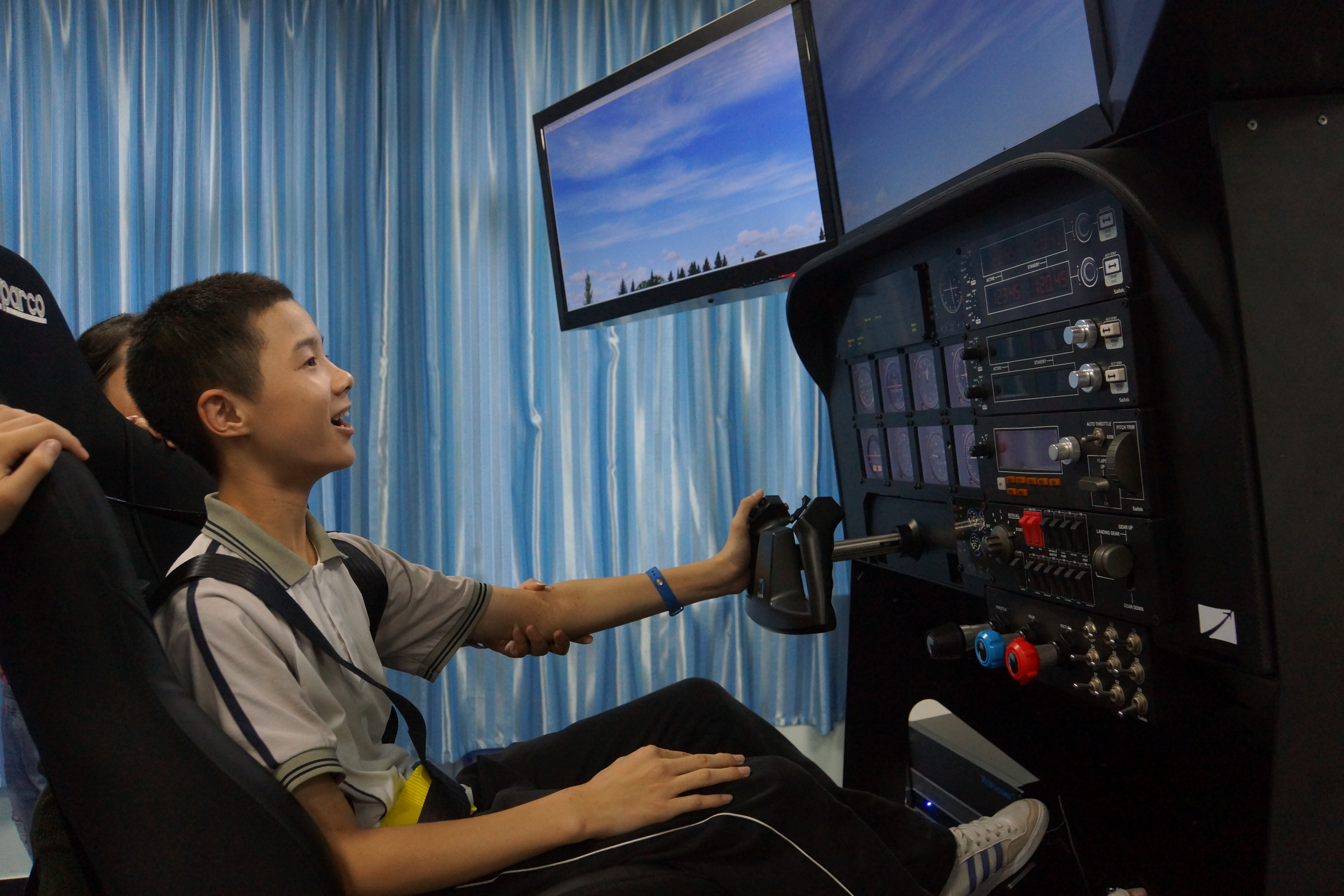 学完了知识,同学们进入实验室,观摩了1:1全仿真环幕模拟飞行器和六自由度全动式模拟飞行器,然后在2016级航空管理专业学生的指导下,分组登上两台模拟飞行器,独立操纵,执行滑行、起飞、爬升、转向、降落等飞行动作,实验室里不时响起同学们的惊叹声和欢呼声。