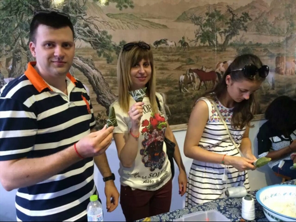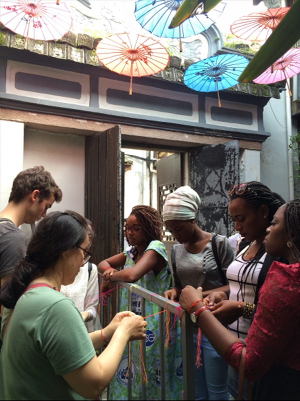 为了迎端午,让留学生们好好体验一把温州人过端午的风俗。潘女士和会馆里的工作人员特地准备了粽叶、糯米和蜜枣,教留学生们包粽子。看起来简单,包起来可不容易,在老师的耐心指导下,学生们包出了一个个“洋”气十足的粽子;除了包粽子,还有学习编制蛋袋,学生们站在会馆的庭院里,头顶上是各色的油纸伞,跟着老师把彩绳一股一股地编织起来,来自喀麦隆的学生施达编起蛋袋来一点也不马虎,连老师看了都竖起大拇指点赞。