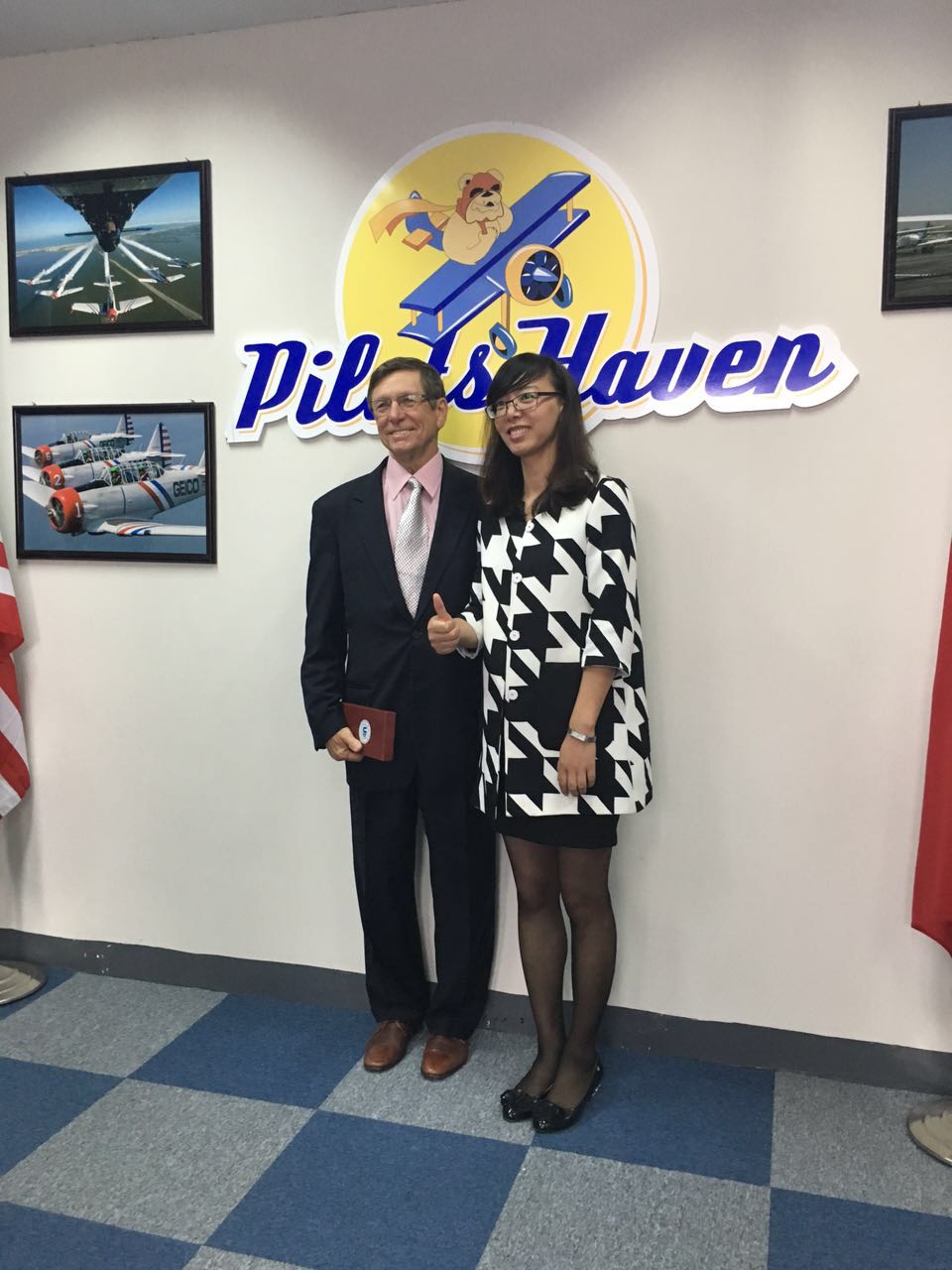 (筹),参观了飞行英语、飞行理论教室和飞行模拟机房,与正在此备考飞行理论模拟考试的FAA国际驾照学员们进行了交流,祝愿他们即将开始的美国学飞之行一切顺利。随后,McCay博士与包含丽副院长和五楼自拍