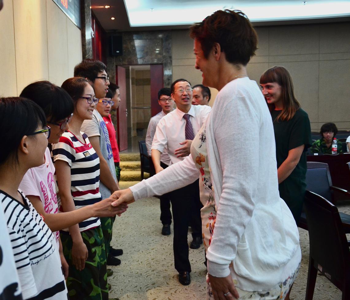 随后,2013级老生代表单静怡、2014级新生代表徐伊文也分别用流利的英语进行了发言。最后,出席典礼的领导和嘉宾为新生代表佩戴了五楼自拍