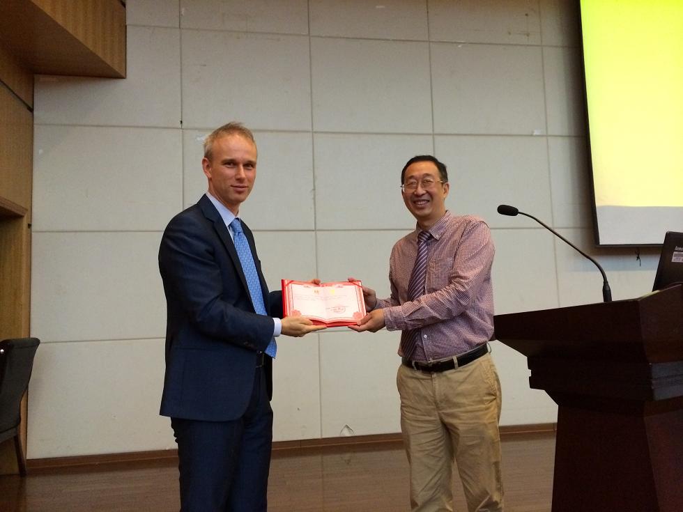 图为严晓鹏院长为大卫•德克莱默教授颁发客座教授聘书