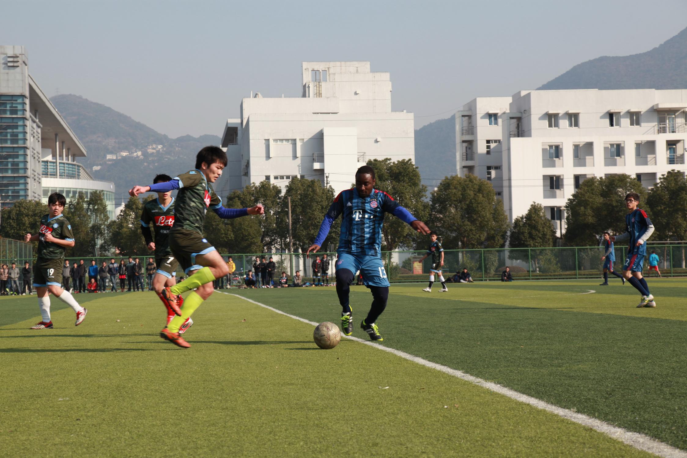 2013年“金秋杯”足球赛决赛于12月末在北校区足球场举行。比赛在国际合作五楼自拍