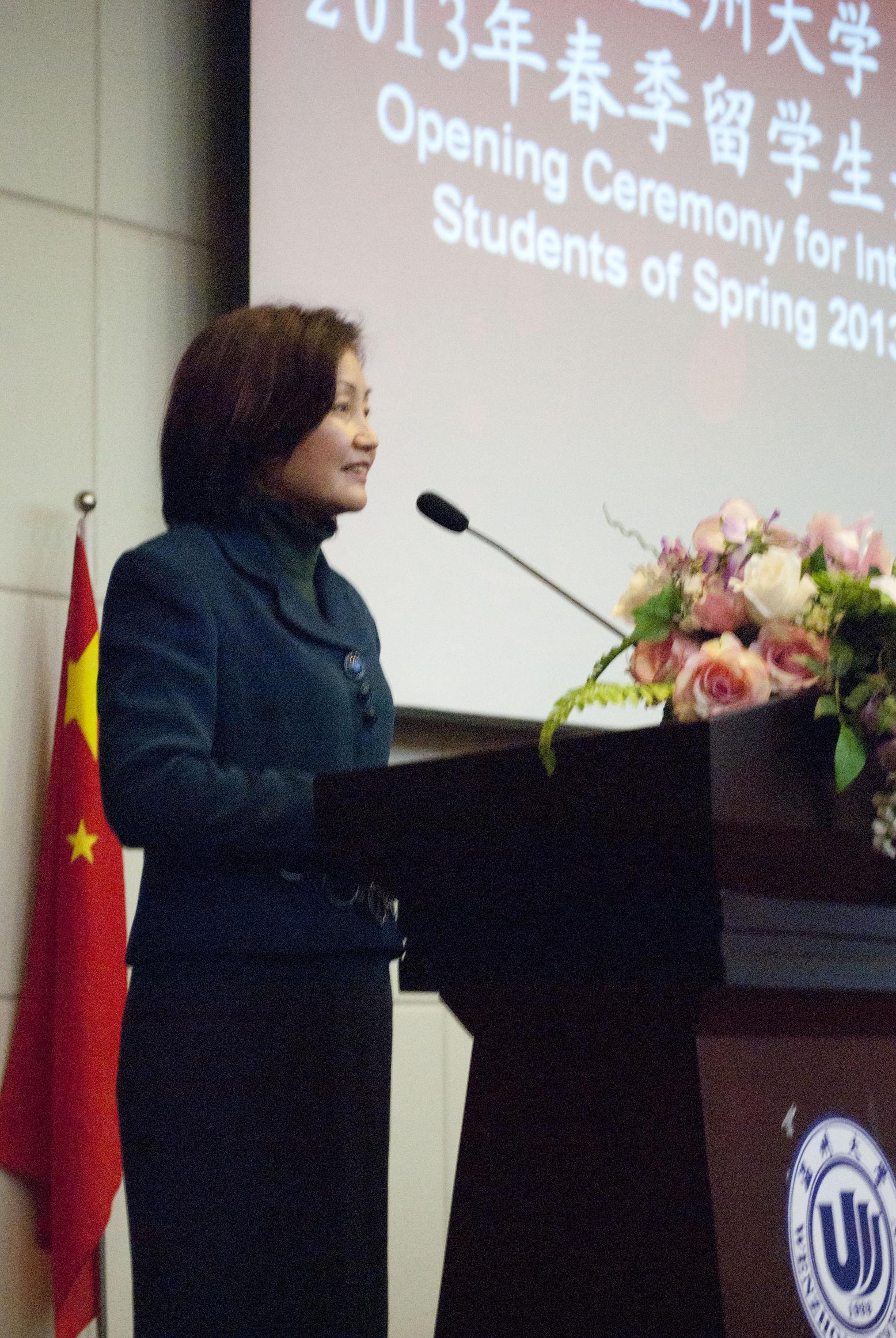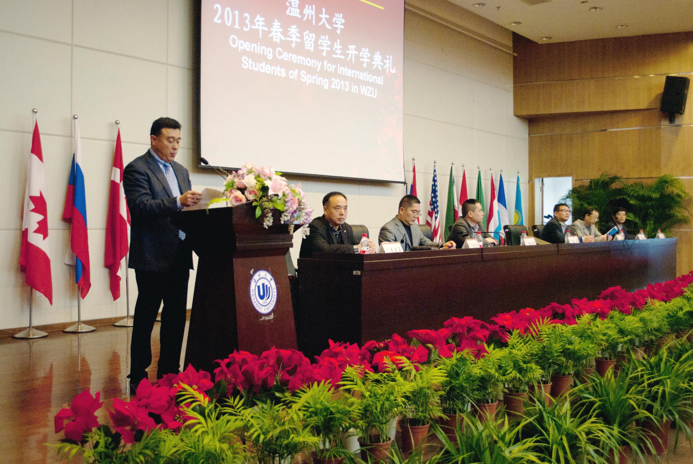 在庄严的国歌声中,典礼正式开始,首先由薛伟副校长致辞。在致辞中,副校长薛伟表示了对来自来自泰国、美国、荷兰、意大利等7个国家的50余名留学生新生的热烈欢迎,介绍了五楼自拍