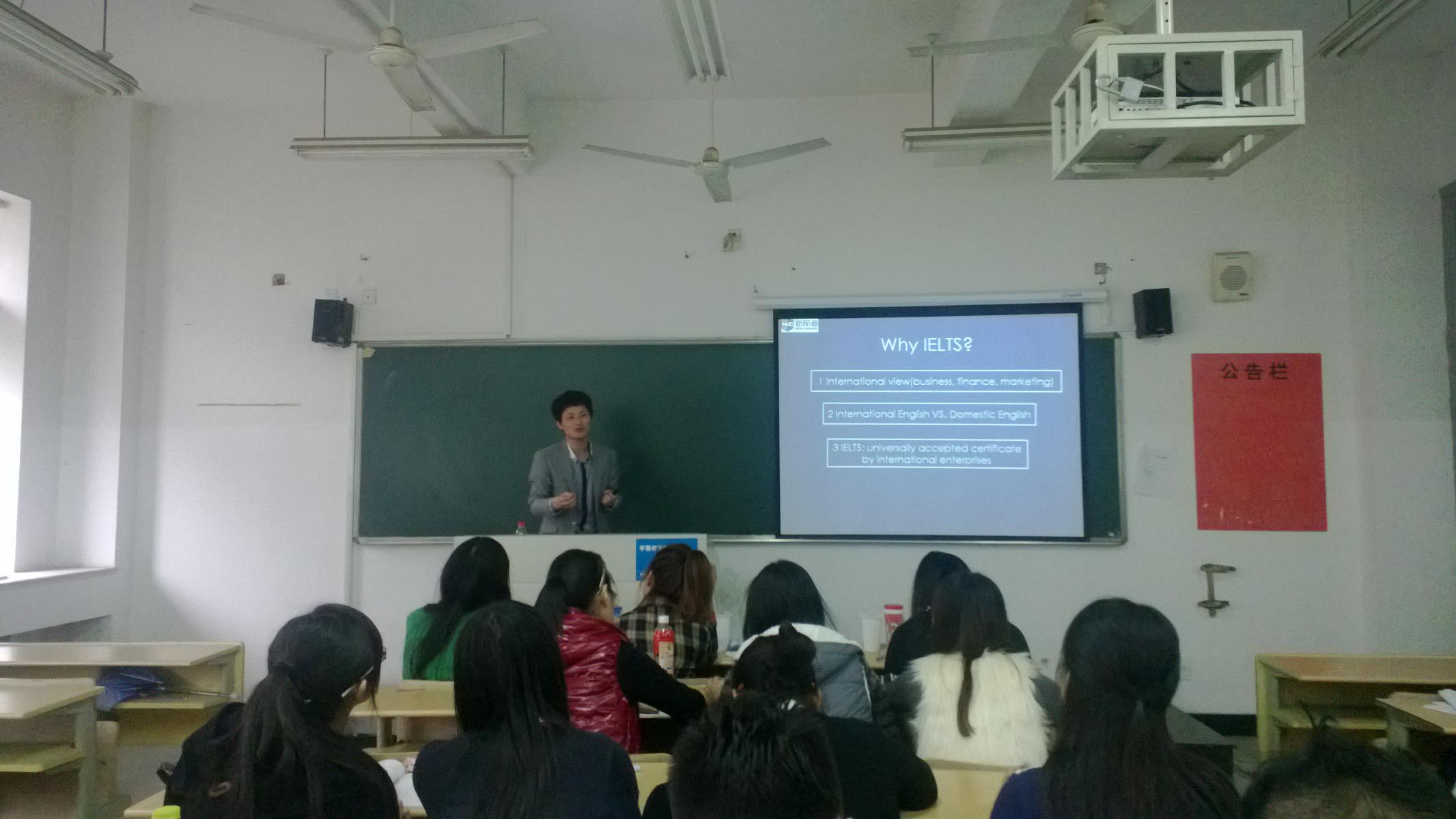 2011市销本(中丹)的全体同学参加了此次活动。Tommy老师围绕什么是雅思考试,为什么要参加雅思考试和雅思考试的重要性几个方面进行了专题讲解,期间,同学们踊跃发言,课堂气氛良好。