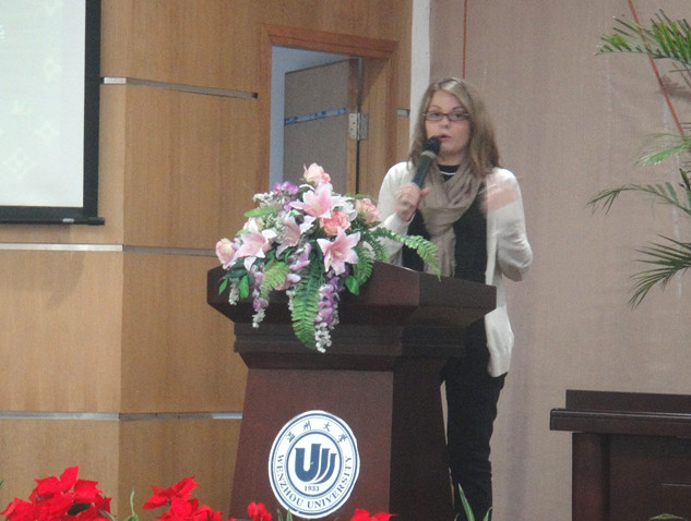Charline女士在热烈的掌声中用英文进行演讲。讲座围绕法国的城市、美食、名人、品牌文化展开。享誉世界的品牌彰显了创建者的智慧与创意,考究的法国大餐透露着法式生活的优雅与精致,矗立在塞纳河畔的巴黎圣母院闪烁着法国人民的智慧,收藏着40万件艺术珍品的卢浮宫散发着其世界艺术殿堂的魅力。精彩的讲座让现场观众领略了法国的旖旎风光和浪漫情怀。