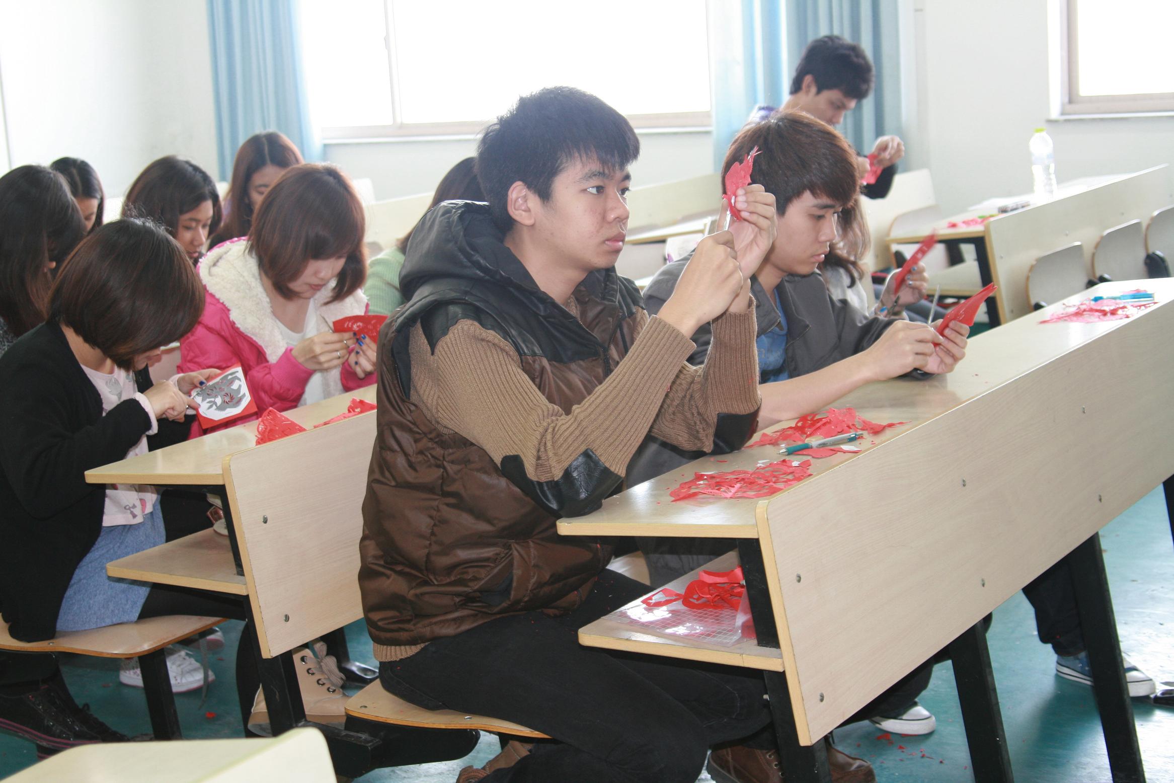 特邀赖施虬老师给留学生讲授中国剪纸艺术。本学期,我们设置了6次课让留学生体验中国剪纸艺术。课堂上,赖施虬老师向留学生展示了不同流派和风格的剪纸作品,一幅幅精美的剪纸图画立刻吸引了留学生们的目光。在赖老师的带领下,同学们饶有兴致地拿起剪刀学起中国剪纸来。两个多小时的剪纸课里,同学们或模仿或发挥,看着自己努力之后的作品欣喜不已。剪纸课结束时,很多同学仍意犹未尽。