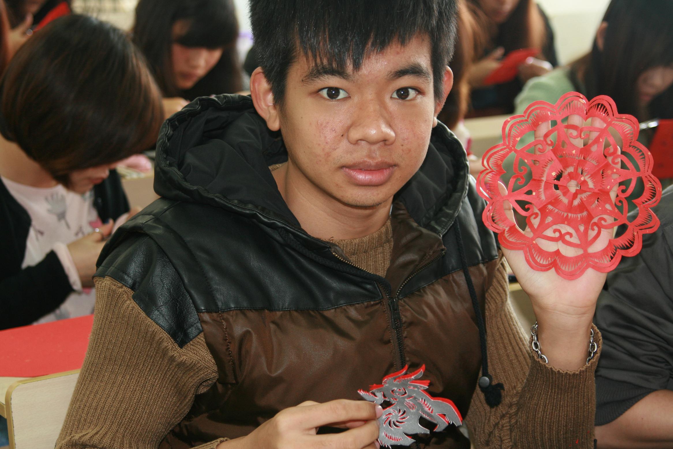 为了让泰国留学新生亲身体验中国剪纸艺术,五楼自拍