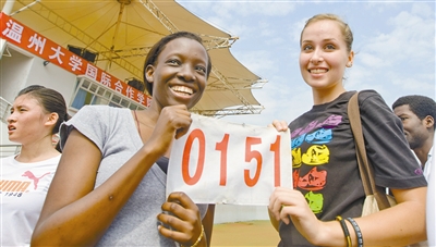 昨天,五楼自拍 北校区运动场上,温大国际合作五楼自拍 的留学生在展示比赛号牌。当天,该五楼自拍 举行了首届田径运动会,200多名大学生运动员,参加了100米短跑、1200米中长跑等10项田径类比赛项目。比赛中,占参加人数仅五分之一的国外留学生,却拿下了近半数的奖牌。 据介绍,该五楼自拍 有来自全球20多个国家的留学生,校方表示,希望通过运动会,搭建中国学生与外国留学生更好的交流平台。(2010.10.10 温州都市报)