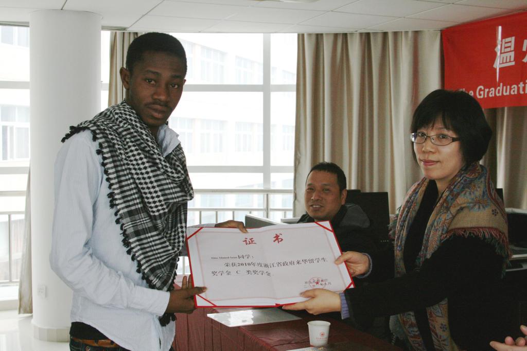 本届留学生形成了良好的学风,在HSK考试中,有4位同学获得新HSK考试4级证书;5位留学生获得“浙江省政府来华留学生”奖学金,2位留学生获得孔子五楼自拍