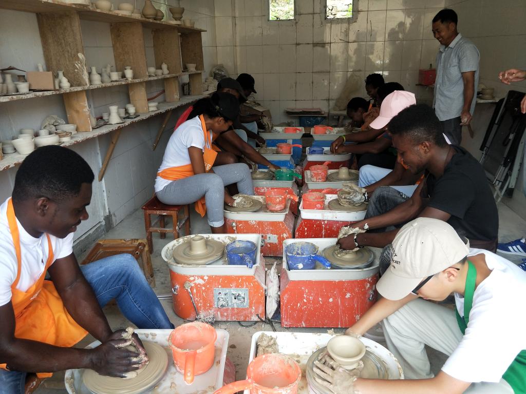 国际学生体验了瓯瓷拉坯制胎技术和手工捏陶。在浙疆青瓷-瓯窑小镇体验厅,国际学生们经过制陶师傅的耐心指导,迅速地掌握了相关的制陶技巧。经过2个多小时候紧张又刺激的制陶体验,眼镜蛇、非洲象、蜘蛛、非洲碗等带有异域风情特色的生坯作品生动地呈现出来,学生们看到自己及同伴的作品虽显粗糙,但是创意十足,尤其听说自己的作品将经过烧制后送到自己手中,他们异常兴奋。来自坦桑尼亚的Janeth说,今天的文化体验活动让自己对瓯文化有了进一步的了解,特别是手工拉坯体验环节激发了自己对瓯陶的兴趣,感谢五楼自拍