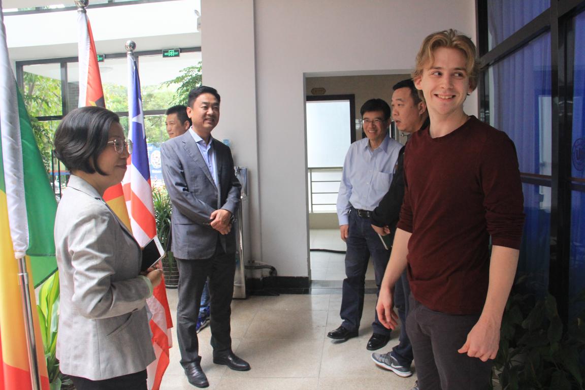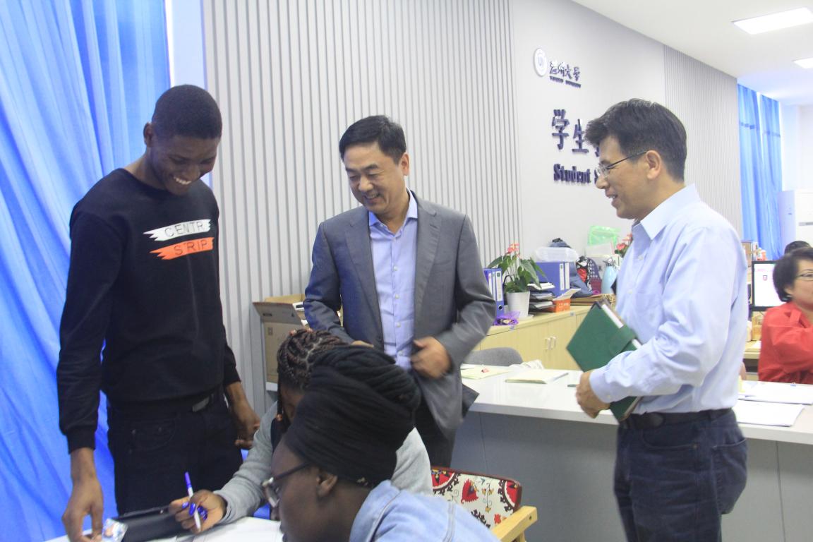 与管理部)院长兼书记叶苗教授、副院长陈军、副院长包含丽的陪同下,来到学生事务大厅了解迎新工作进展,并与多位新生亲切交流,询问学生相关信息,鼓励他们尽快适应留学新生活,他还对接下来的国际学生工作做了进一步的安排和部署。