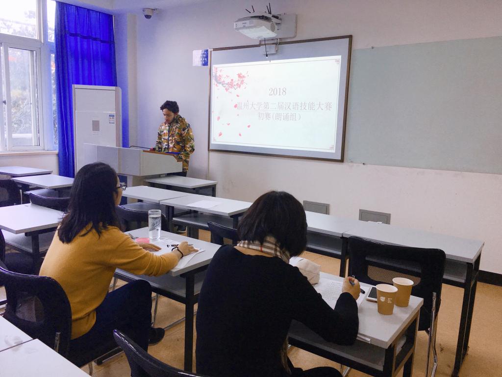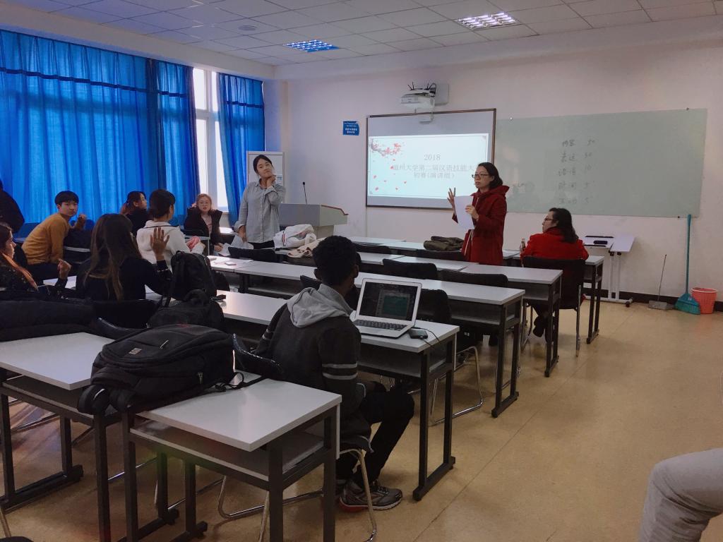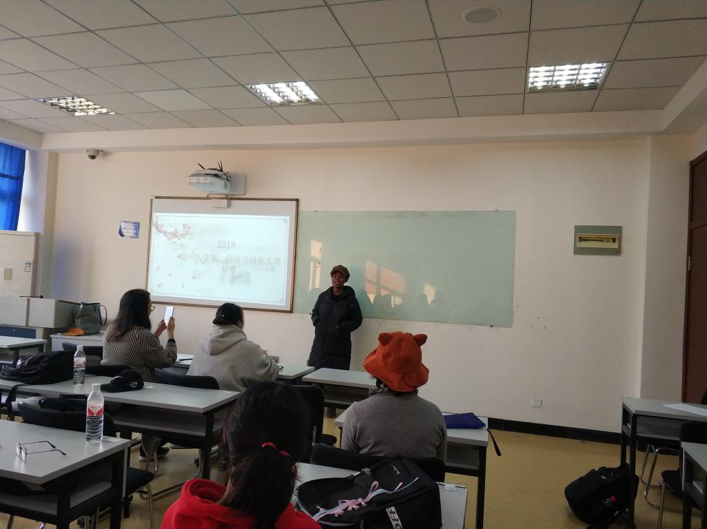 举办,来自韩国、泰国、喀麦隆、意大利、乌干达、埃塞俄比亚等多个国家的留学生参加了本次比赛。本次比赛涵盖演讲、歌唱、朗诵三个类别,分别在不同的教室同时进行。为了确保本次大赛评比的公开、公平、公正性,本次比赛邀请了六位老师作为此次比赛的评委。其中郑婷和金碧两位老师为演讲组的评委,阚文文和徐丽丽两位老师为朗诵组的评委,包含丽和张珉璐两位老师为歌唱组的评委。在比赛开始之前,各位老师首先向学生细致讲解了本次比赛的基本要求和打分细则,并通过抽签的形式确定参赛选手的顺序。