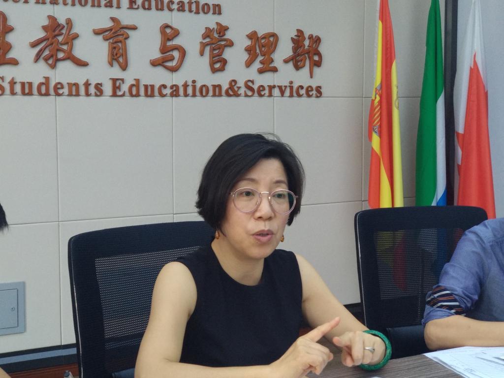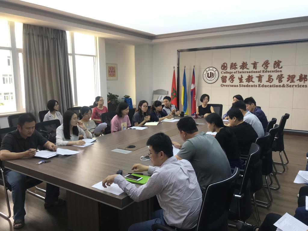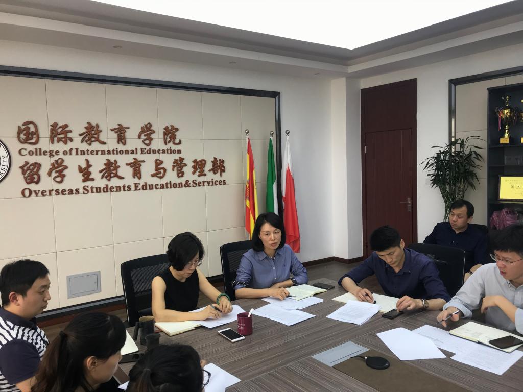 、文明寝室检查、校内外住宿管理、居留许可办理等方面通报了近段时间开展的主要工作和存在的安全隐患,布置了国际学生重要舆情定期通报以及本研国际毕业生的典礼、校友、档案和安全离校工作。姚华结合国际学生的学习成绩、学业预警、毕业审核、培养方案等方面反馈了期中教学工作检查情况。学生科副科长谢坚就国际学生综合素质中期测评工作的目的、具体操作流程和有关注意事项等内容进行了说明。