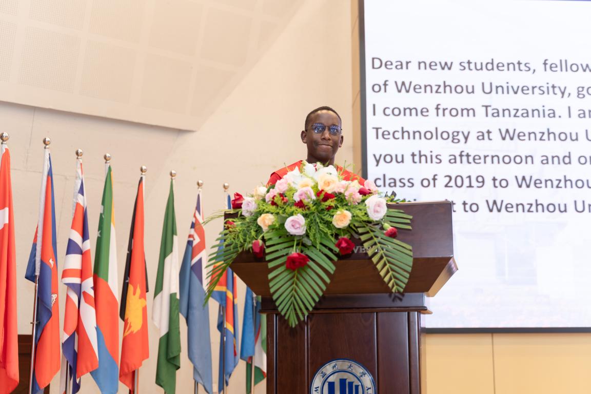 开学典礼上新老国际学生代表发言引起阵阵掌声。来自坦桑尼亚的2018级计算机科学与技术专业学生陆求是同学说,自己刚来温大的时候还不太适应,慢慢地身边的老师和同学给了他很大帮助,让他逐渐学习汉语,也学会了很多新的生活技能。陆求是还是今年一等校长奖学金的获得者,他说道:“五楼自拍