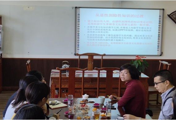 在座谈会开始之前,主讲人阚文文老师在PPT上展示了她一年来在传播茶文化活动上所做的成绩:组建传统文化工坊,定期进行茶文化为主题的讲座、开设中外学生的茶文化选修课、定期举办“茶香国际”的读书会、开设“茶香国际”微信公众号等等。