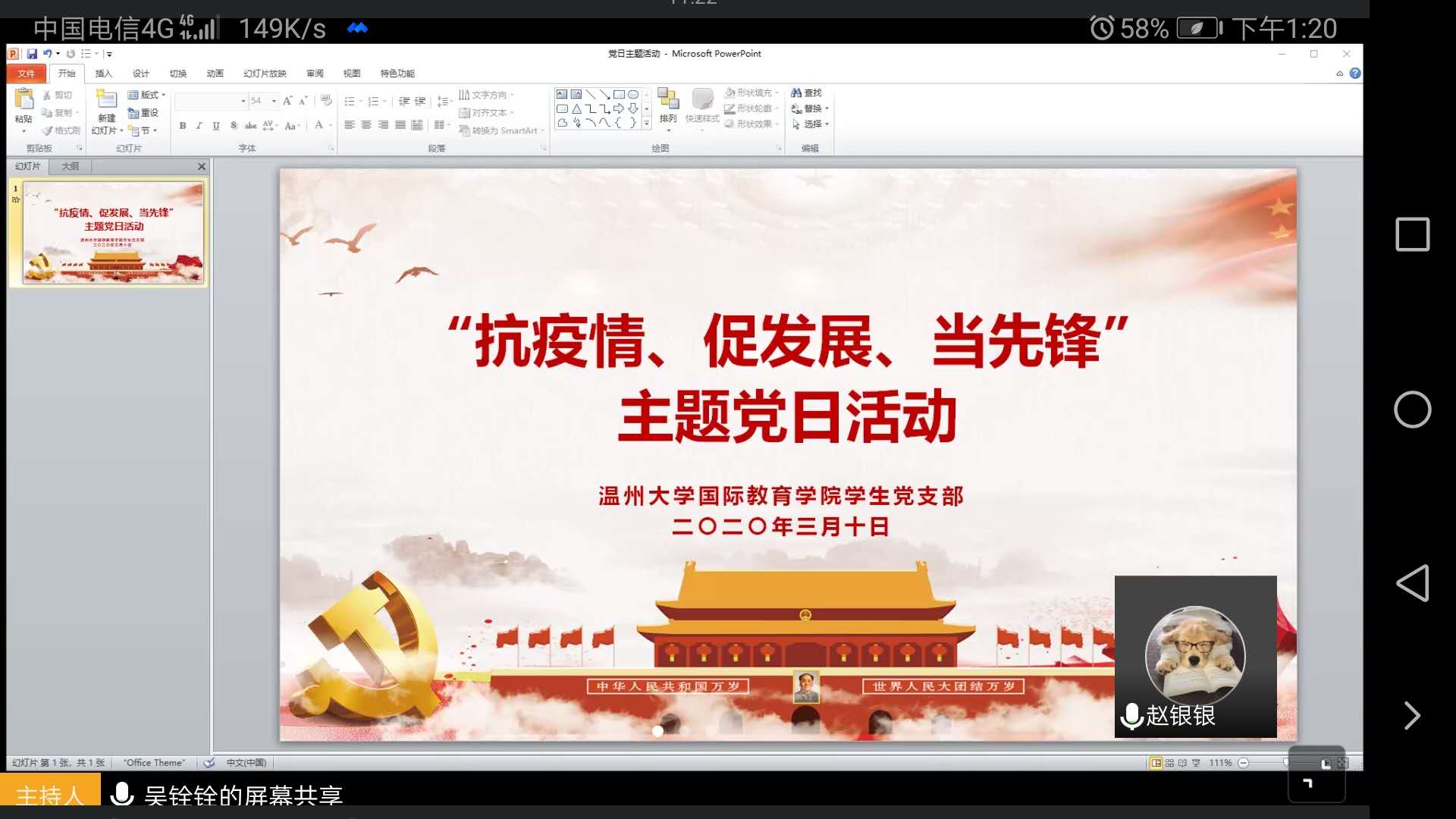 学生党支部也积极创新,采用线上视频会议形式开展了新学期的主题党日活动。支部全体学生党日如期参加活动,由学生党支部书记吴铨铨主持。