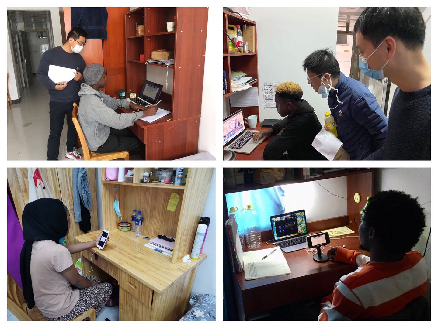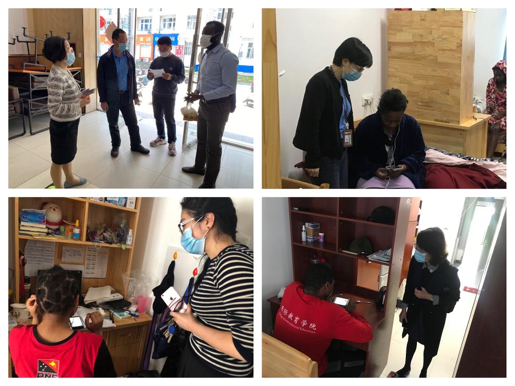 D区1号楼和2号楼40个寝室7个专业的学历生和语言生进行了线上课程走访工作,深入了解开学至今国际学生线上课程的上课状态、学习体会、以及对线上课程的意见与建议。在走访过程中,叶院长对留宿国际学生的线上教学提出了几点要求,包括按时上课、认真听讲等,遵守线上课程纪律,按时完成作业,为期末考试做好准备等。除了学习之外,叶院长同样关心疫情防控期间学生的生活情况,让国际学生感受到“疫情无情人有情”。