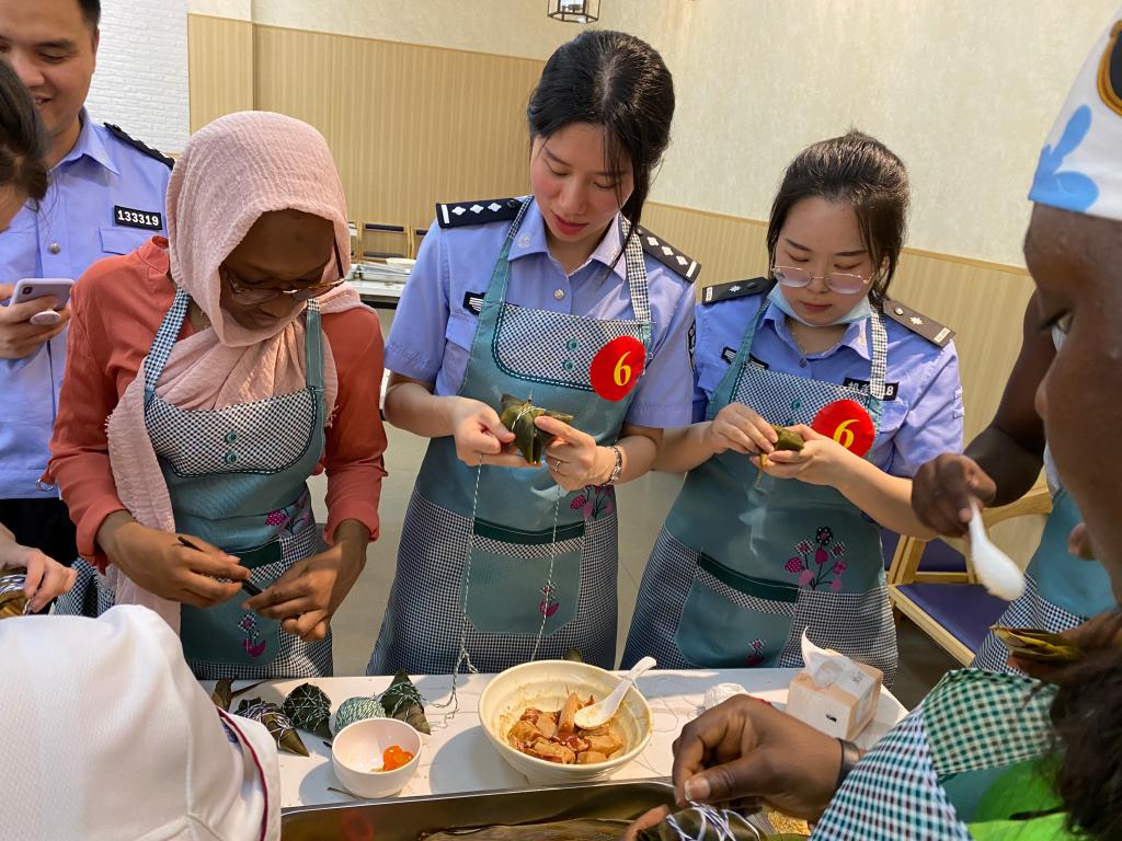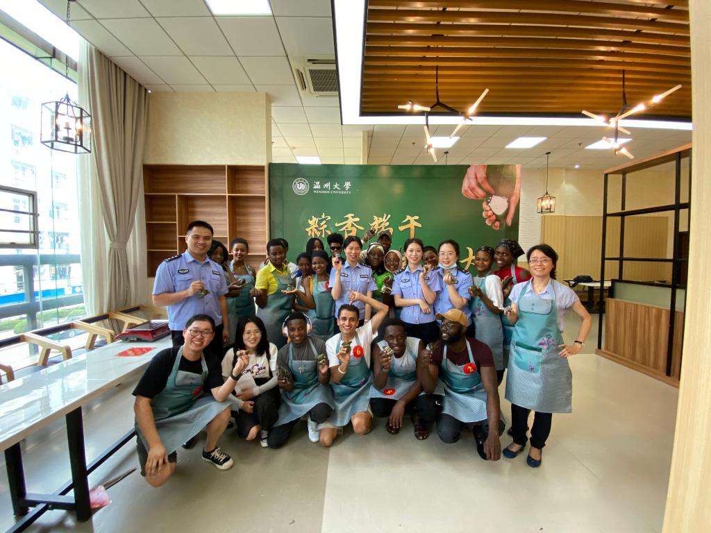 老师,还有后勤部门工作人员一起动手,制作自己喜爱口味的粽子。虽然一些留学生刚开始还不懂得要领,但是随着一个又一个粽子出炉,他们的手法也渐渐娴熟起来。来自瓯海区出入境管理局的几位民警也参与到活动中来,与留学生一起包粽子,体验这夏日里的粽情粽意。