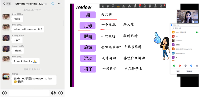 本次公益培训的内容主要是在HSK2级的基础上,逐步提升国际学生的汉语水平并通过HSK3级。考虑到已回国的学生因时差带来的不便,培训时间定在每个工作日的下午三点到五点。培训的方式主要是通过使用ZOOM软件在线教学并录下课程供学生回放观看。据悉,早在开课前一天就有120余人加入培训微信群,学生们在微信群里询问上课时间和内容,表现出了极高的学习热情,授课教师也在群里积极地与学生互动答疑。尽管此次培训没有学分的要求和考试的压力,但是学生们还是会按时上课、认真听讲。据授课教师说每次课后作业,学生都会按时提交。根据调查,学生们希望五楼自拍
