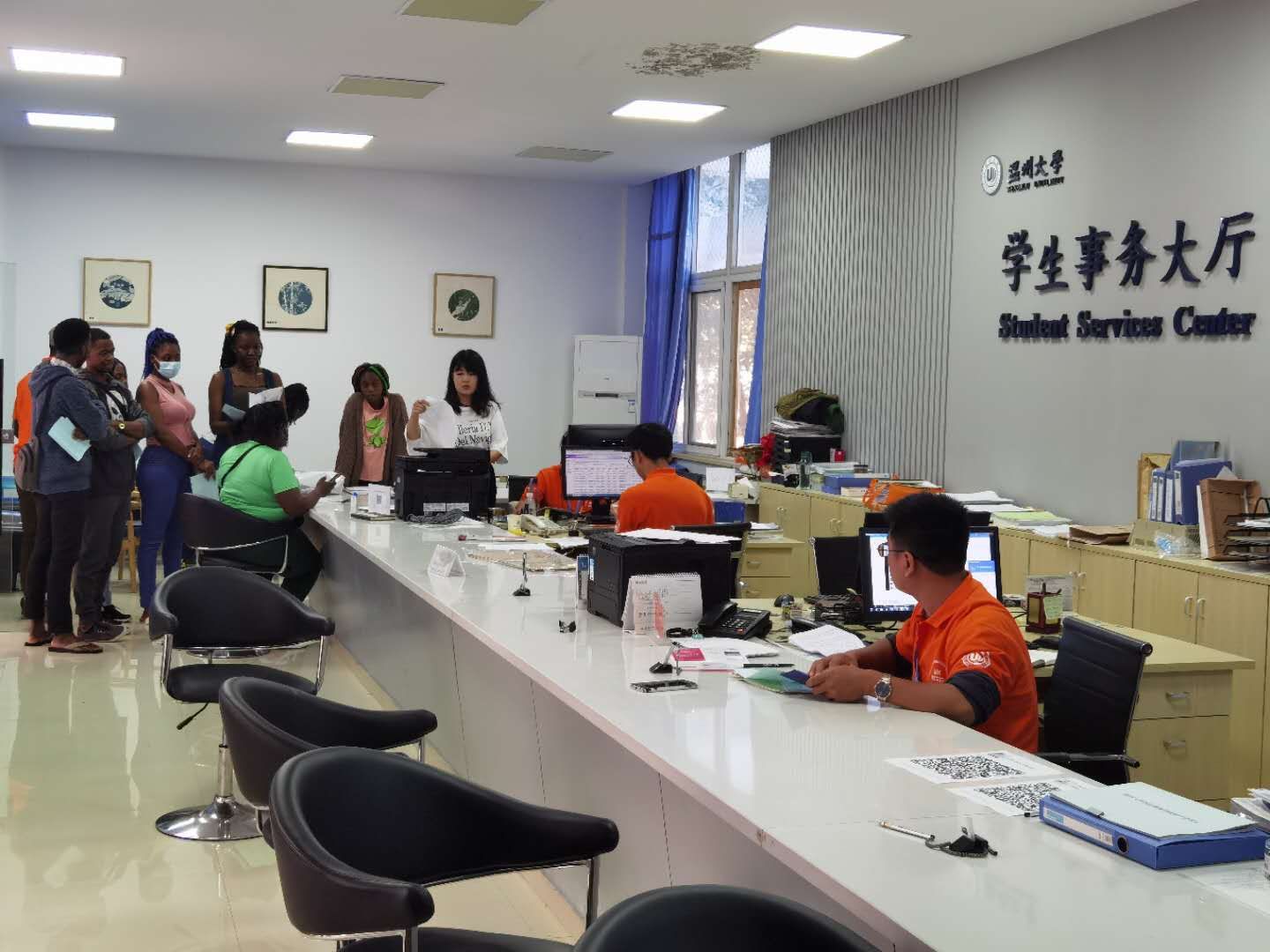 迎来2020级留学生新生。北校3号国际楼一楼的报到注册大厅内,各位老师已准备就绪,提前确定好报到注册流程和迎新资料,等待新一届留学生的来临。受新冠疫情的影响,尚有20多位留学生在中国境外不能前来报到,但是这丝毫没有影响各位老师的热情,不仅换上统一的迎新服装,还为新生们准备了学生手册、校园地图、学生风采、笔记本、笔、定制T恤等迎新“大礼包”,并贴心地为他们送上校园指南,指导下一步的注册流程。