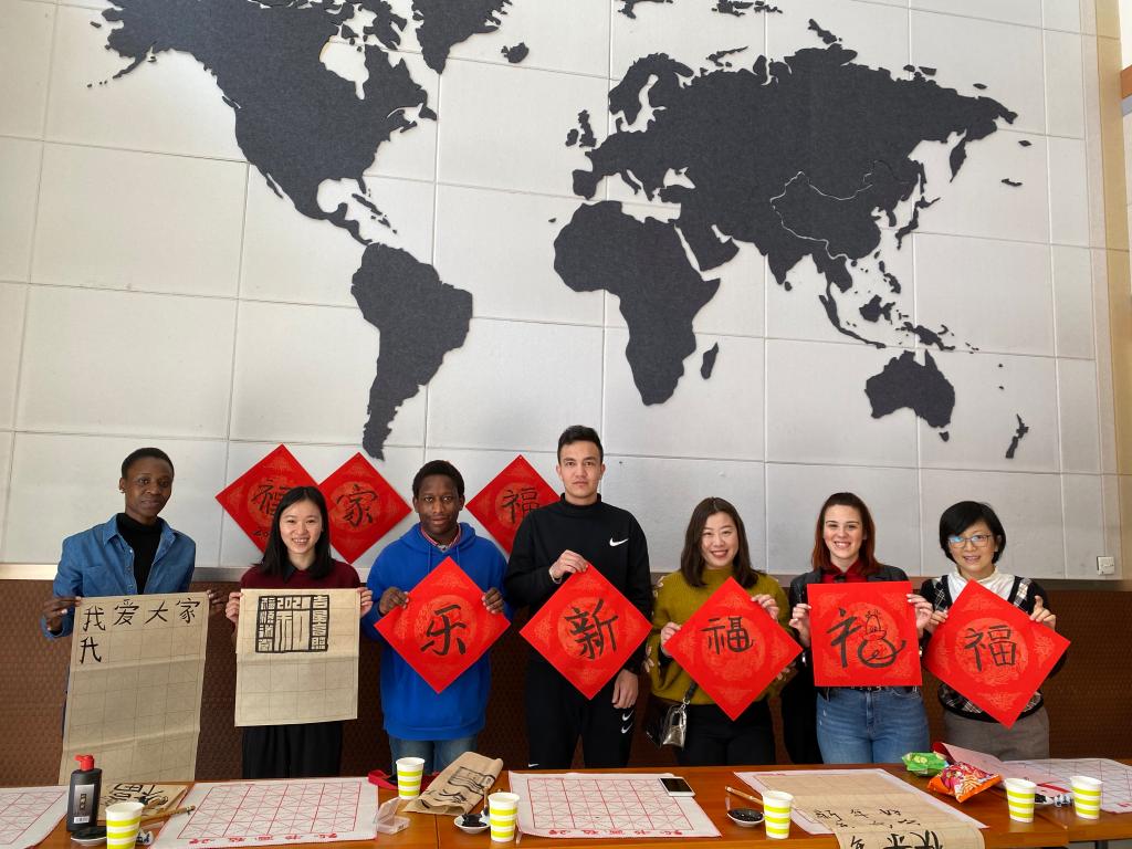 ,正在非常努力地学习中文,多多体验中国文化,希望能够一直留在中国;来自津巴布韦的20级汉语言专业学生李凯文已经在这里学习了4年多,他表示学习书法写“福”字是一个令人耳目一新的活动,虽然学校领导来的时候他有点紧张,但结果一切顺利,大家都玩得很开心,他也学到了更多书法知识;来自坦桑尼亚的留学生陆求是说,“今天对五楼自拍