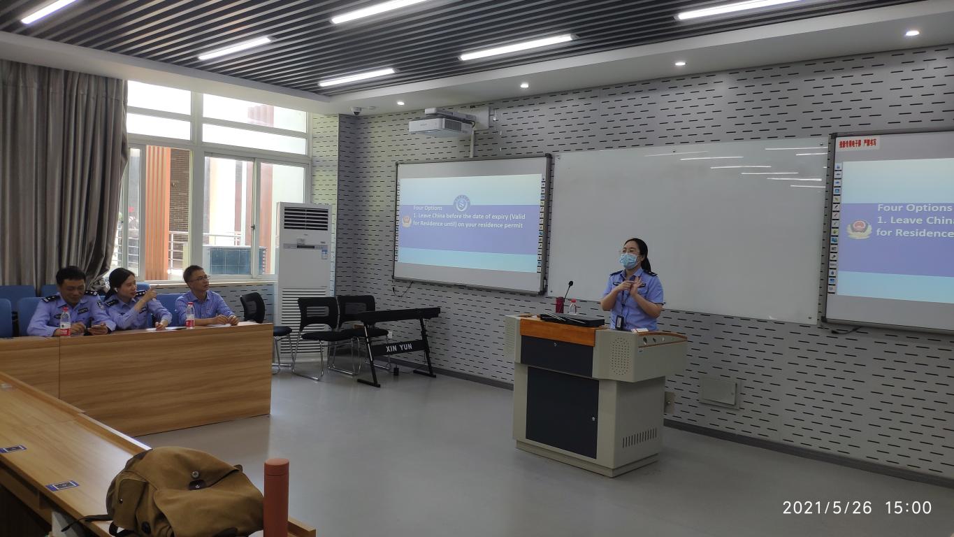 国际学生“政策法律宣讲进校园”专题讲座在3-201成功举办。本次讲座由瓯海区出入境管理大队民警郑剔主讲。温州市瓯海区出入境管理大队大队长张海敏、民警陈小菲、五楼自拍