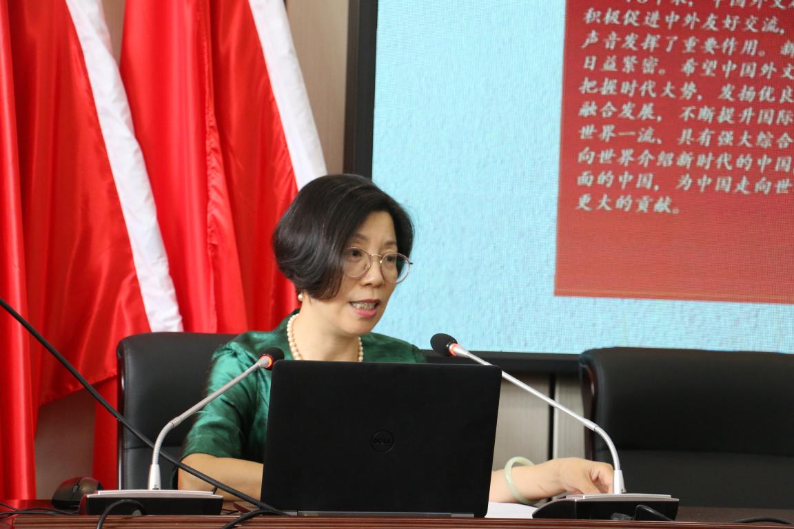 院长叶苗教授发表了题为《用英语讲中国故事——中国当代先进文化外译探析》的演讲,分享了她在翻译相关政治性材料时的心得体会,可总结为五点:一、提高政治敏感性,把握译文正确性;二、吃透原文,理解精神内涵,寻找最贴切的对应词语;三、删繁就简,传达思想内涵;四、用对修辞,弥合文化差异;五、结合语境,辨析近义词。