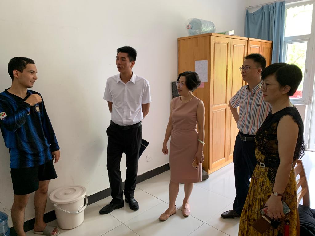 随后,检查组一行来到留学生公寓,现场查看了公寓日常值班表、留学生访客登记表。同时走进学生寝室,查看宿舍用电安全,并随机与留学生交流,了解校方对疫情防控、日常安全的宣传五楼自拍